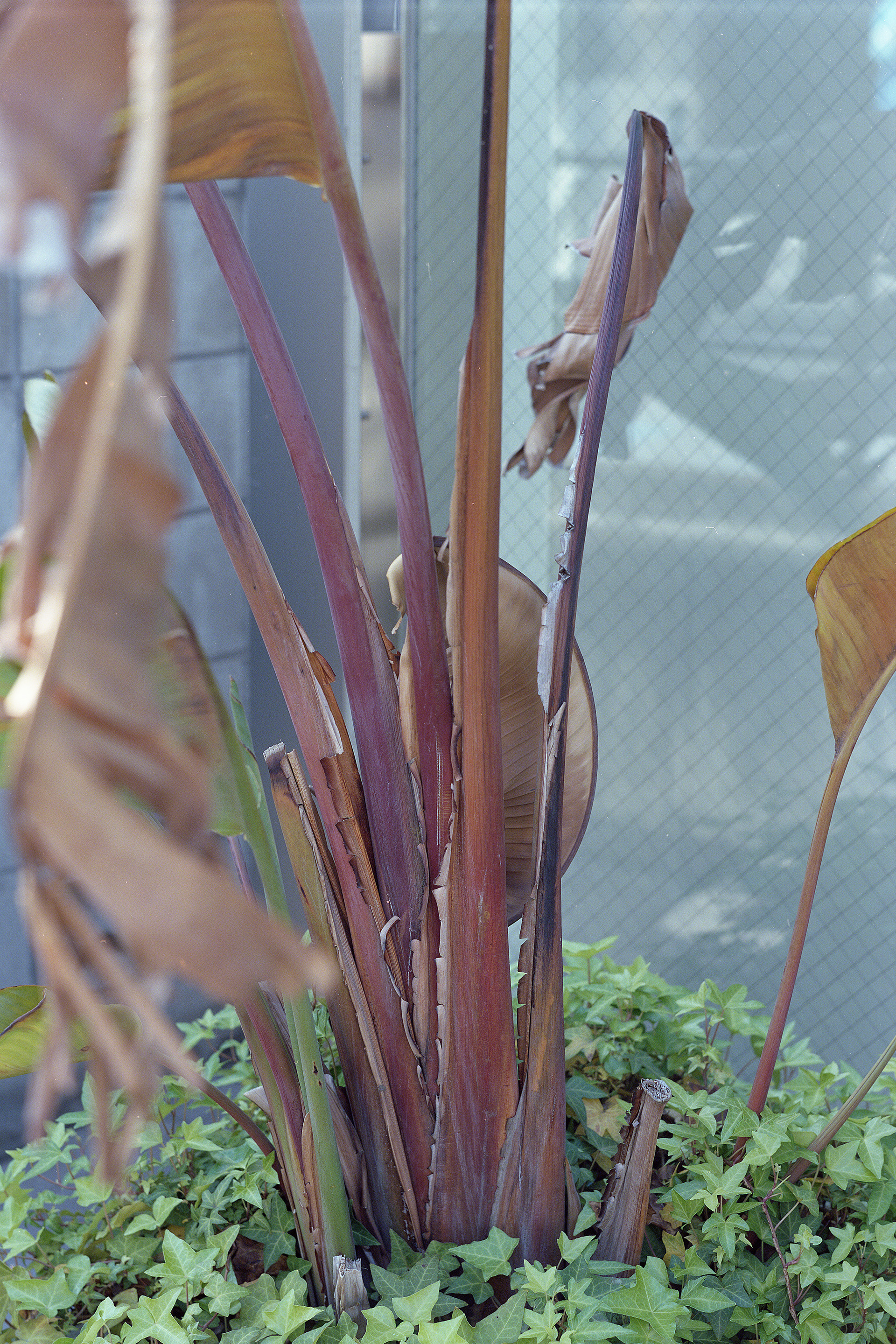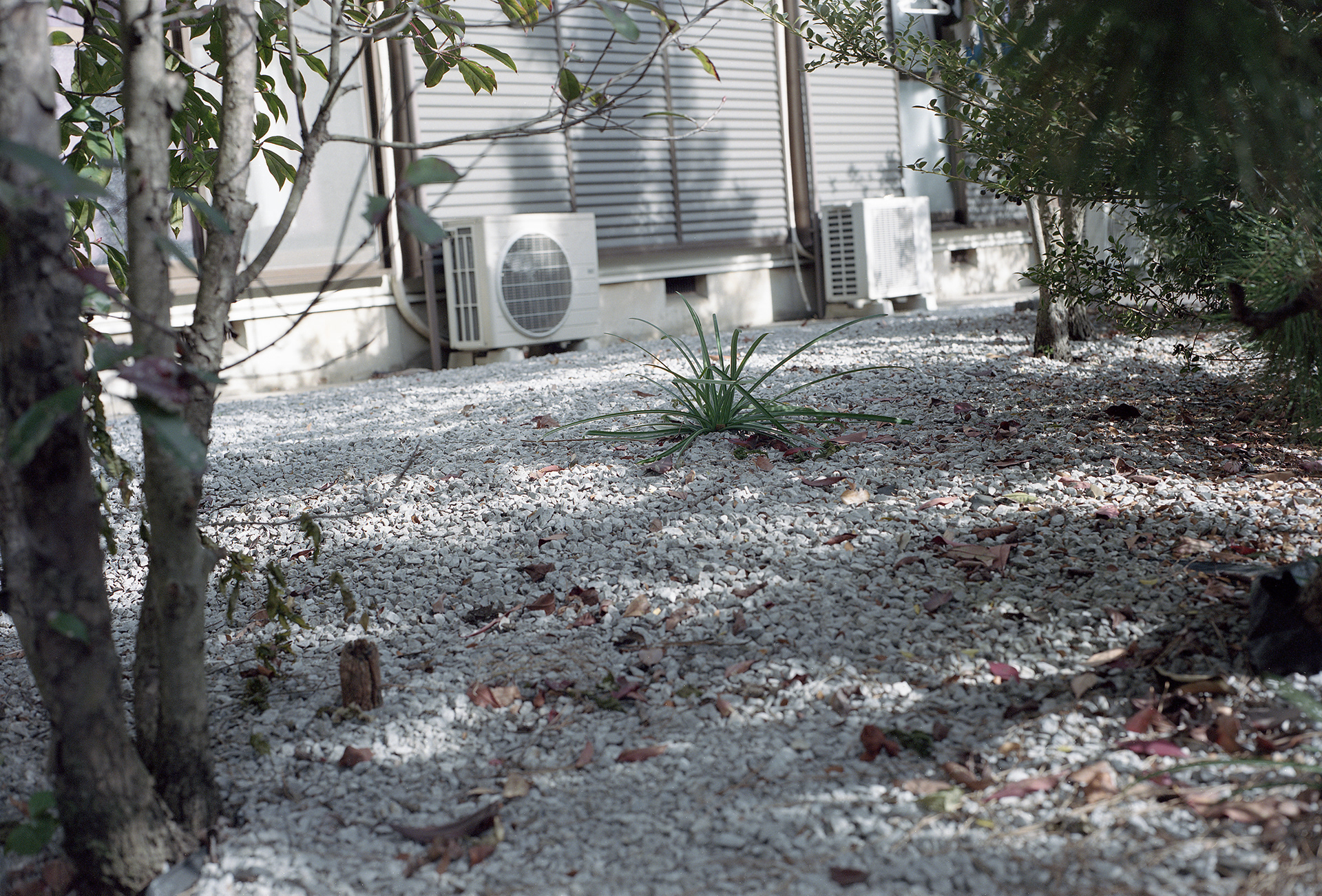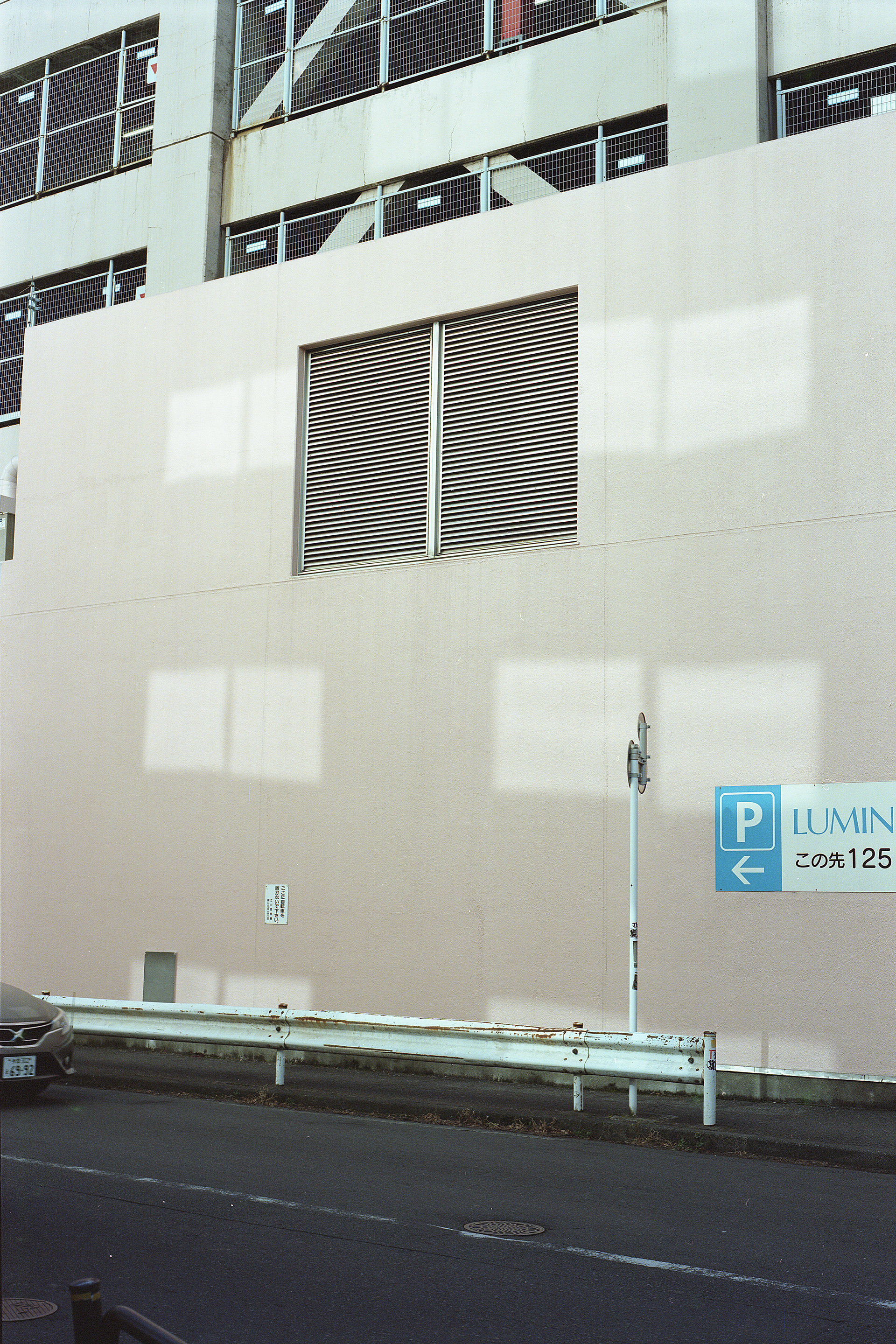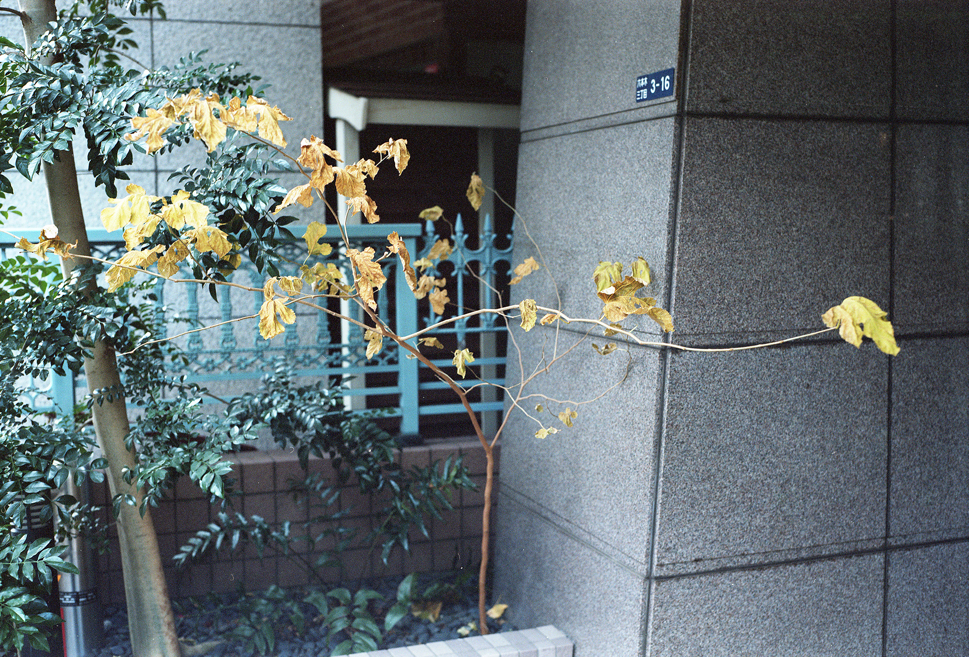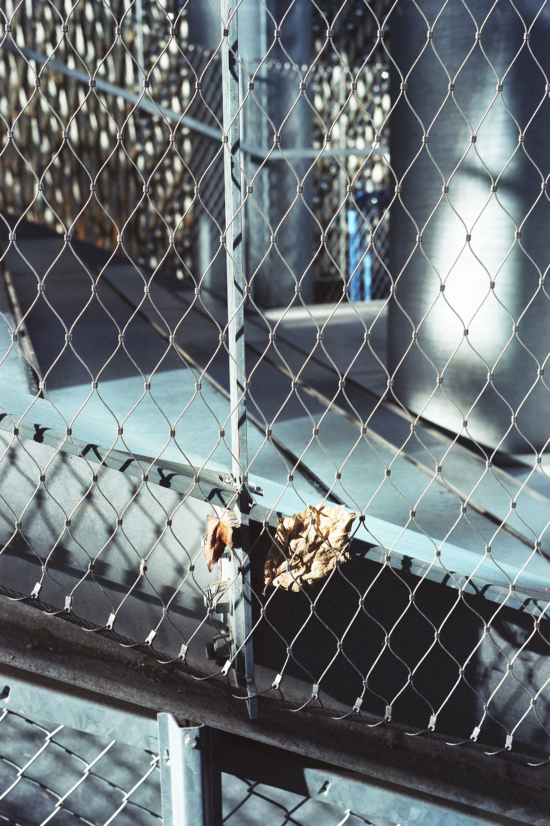 さらに外へ。商業施設の外壁に張られた網目に、風に運ばれてきた枯葉がひっそりと付着している。等間隔のメッシュを横切るように葉脈の微細な線が重なり、人工の秩序と自然の偶然が、図案の上で一枚の作法を編み直す。葉はただ留まっているのではない。そこに留まることで、視線の通り道をわずかにねじり、網の「機能」を別の意味の格子へと変換する。インデックス以上に、情動の付着は、物質的にも、大脳皮質的にも経験される。見逃してしまいそうな軽さと、見続けてしまう粘りーその矛盾に、写真はよく耐える。露光の一回性は、この偶然をやり直し不能の配置として歴史化し、網と葉の接触が、秩序/逸脱・制御/流動という対立軸を単なる概念ではなく、表面に貼られた緊張として保存する。