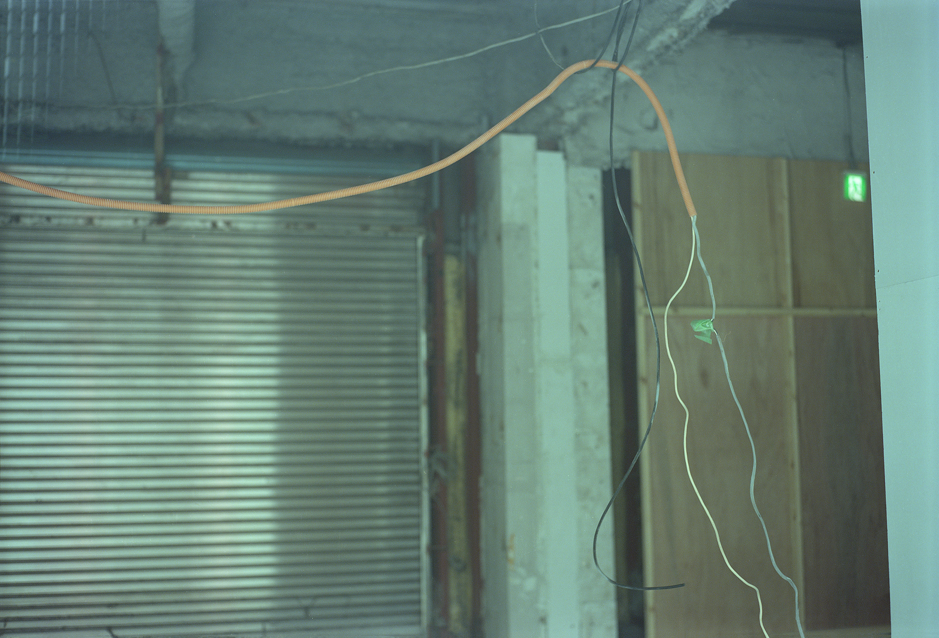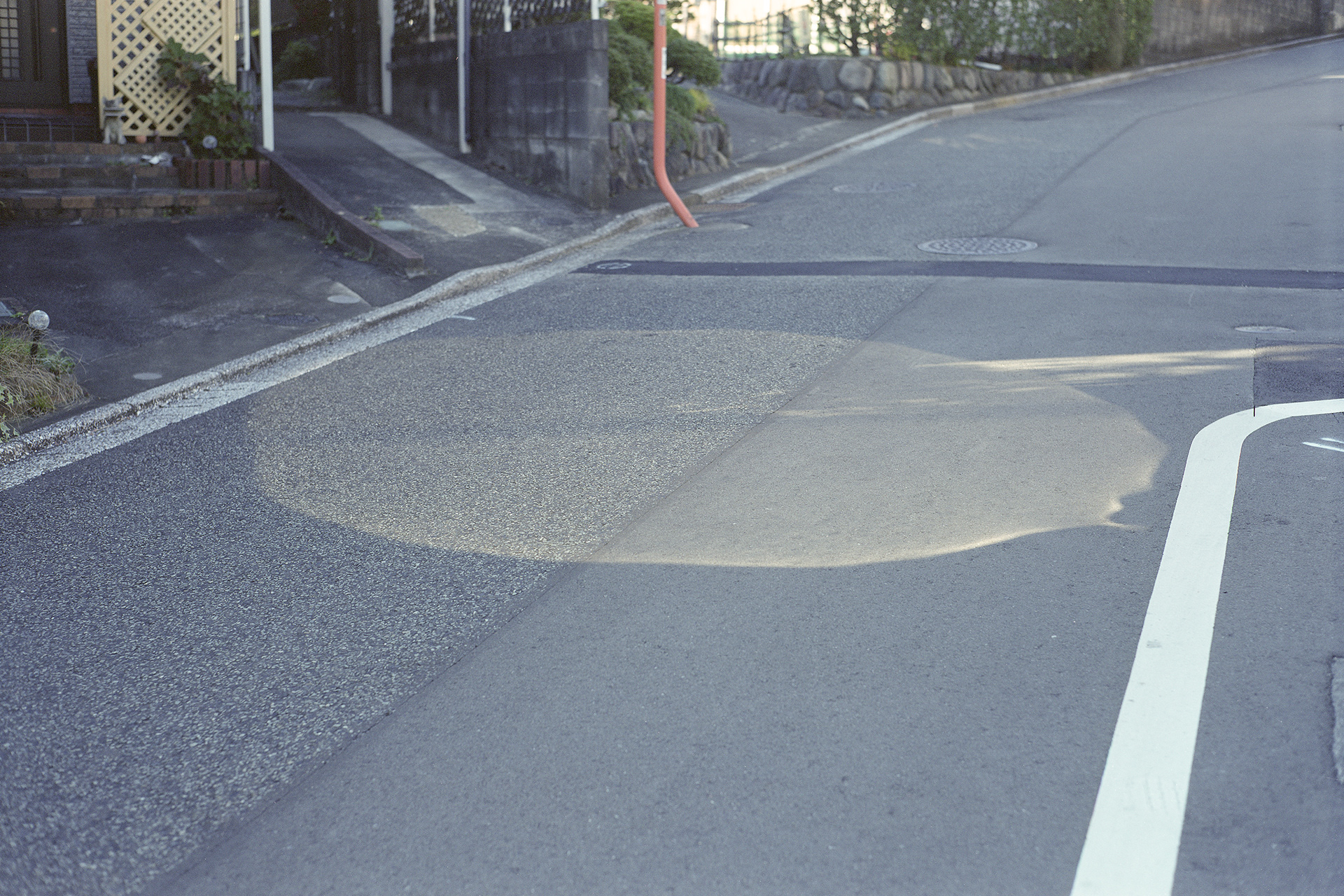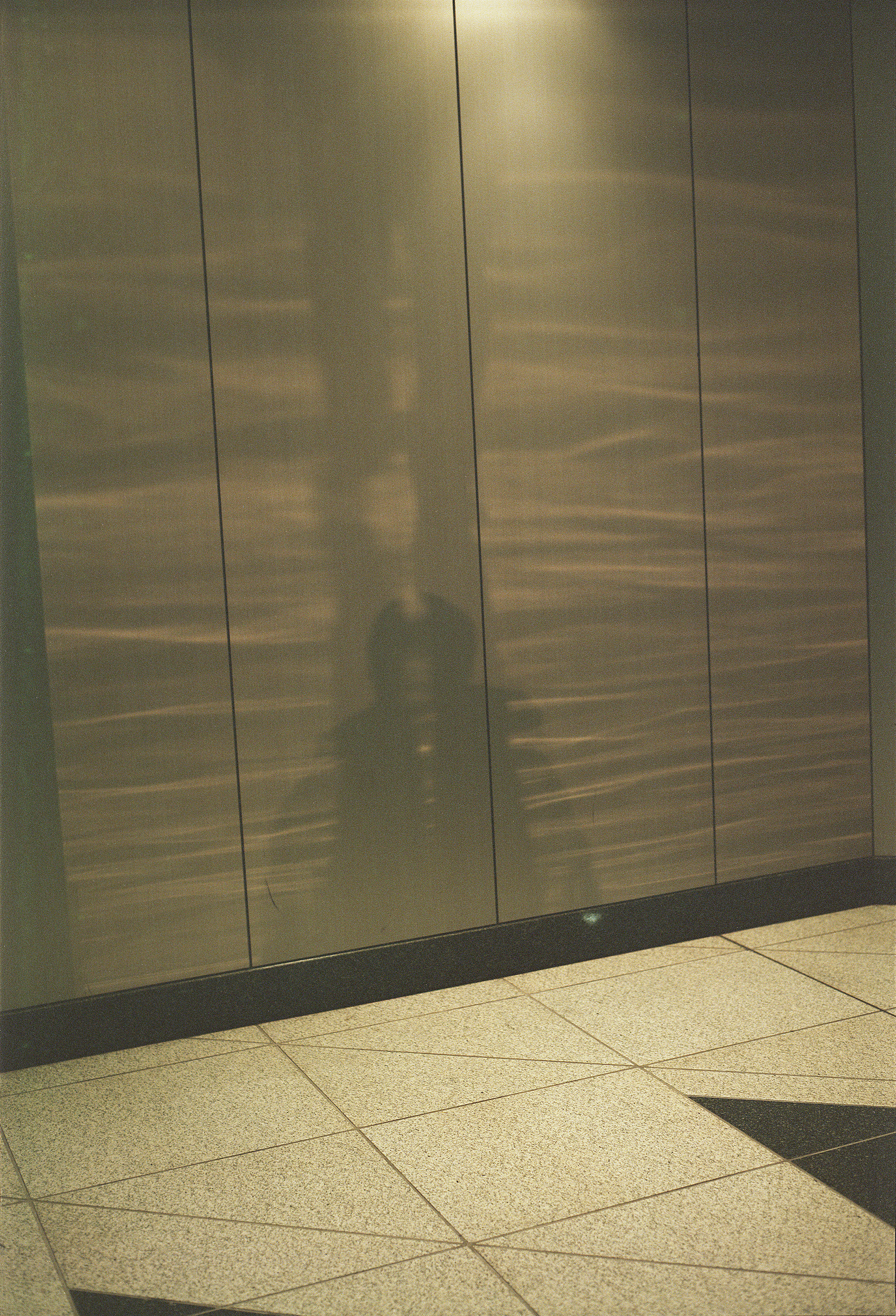 場所を移す。ガラス扉越しの自然光と天井の灯が交錯する廊下で、人工大理石の床が鈍く光り、壁にはひとりの身体の二重の影が浮いている。複数の光源と反射によって輪郭は二本の線に分かれ、ところどころで重なり、また離れてゆく。どちらが「本当の影」か、と問うた瞬間、その問いは意味を失う。影は物体ではなく、光学的配置が生みだす非物体的な出来事であり、表面に浮かぶ事件である。写真はこの事件に薄い時間の断片という重みを与える。押し込められた瞬間、影は存在の証明ではなく、同一性の裂け目として現前する。私たちはいま・ここにいるはずなのに、像はわずかに遅れ、少し先へ滑る。その遅延は、不安や手探りといった“弱い感情”の音程で身体に残り、鑑賞の速度を抑える。「写真=意味を固定するメディア」という通念を明確に反転する。「すぐに分かる」ことの快楽が剝ぎ取られ、遅く観ることが、はじめての経験となる。